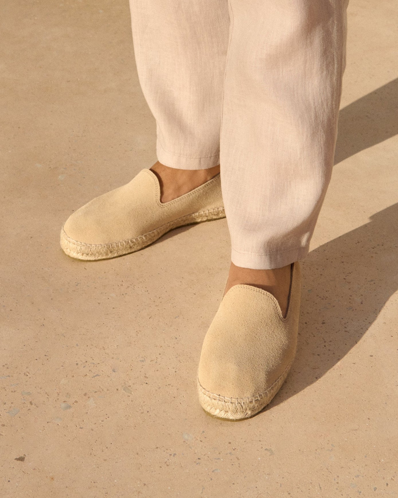 These suede espadrilles reinterpret the classic silhouette with a refined and functional twist. The soft suede upper comes in an elegant champagne beige shade, pairing naturally with summer looks.