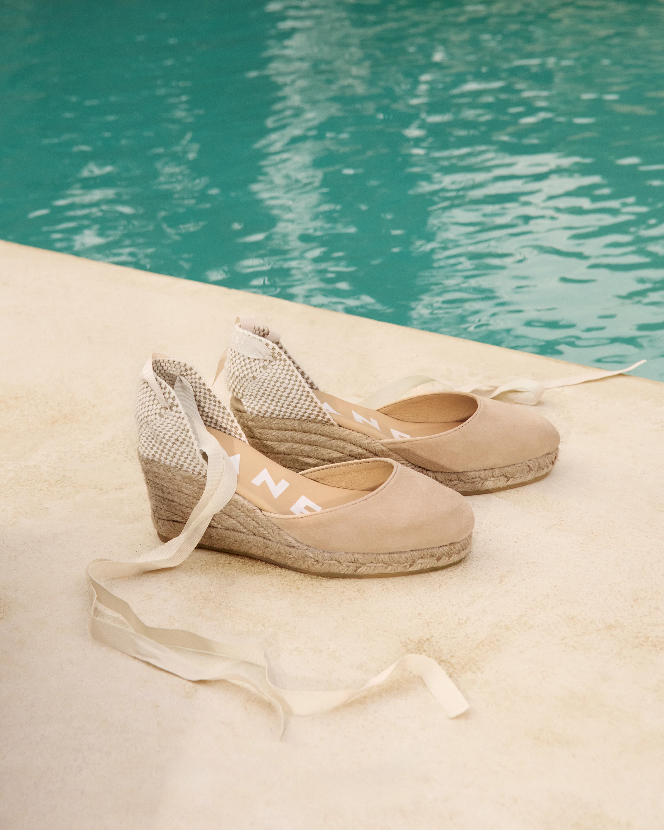 Channel classic summer elegance with these champagne beige wedge espadrilles.